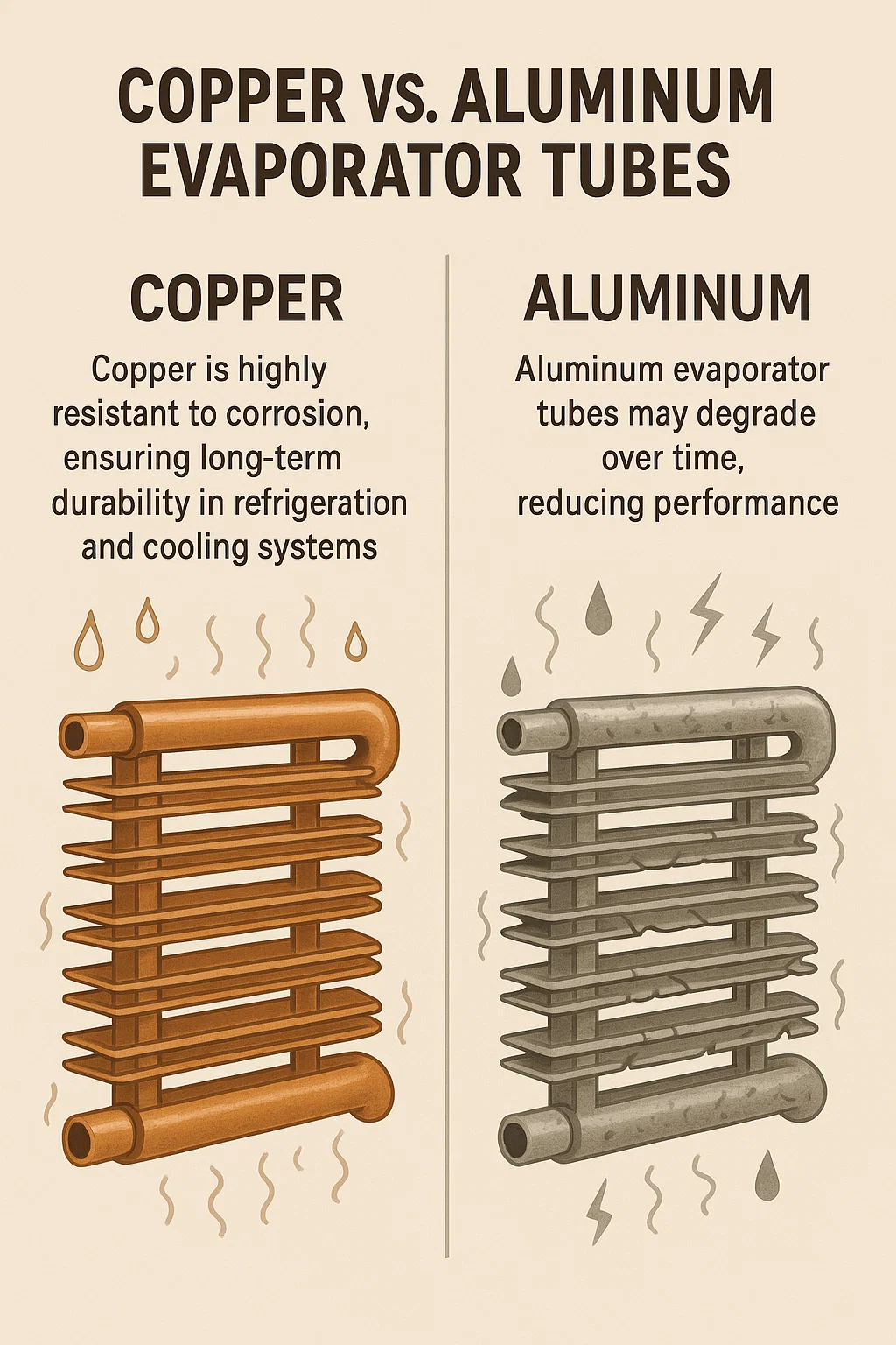 알류미늄 , 반면에 더 취약하다. 산화 그리고 부식 , 특히 습기나 높은 습도에 노출된 환경에서는 더욱 그렇습니다. 시간이 지남에 따라 알루미늄 증발기 튜브의 성능이 저하되어 성능이 저하되고 더 자주 유지 관리 또는 교체가 필요할 수 있습니다.