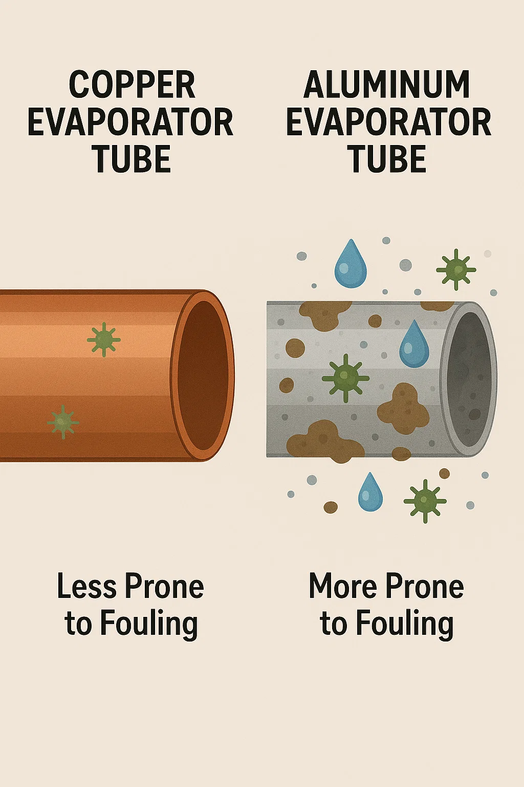 알류미늄 , 부식에 강하지만 오염되기 쉽습니다. 알루미늄 튜브의 표면은 먼지와 잔해물을 더 쉽게 끌어당길 수 있으며, 습기가 있으면 박테리아와 조류가 번식할 수 있는 환경이 조성될 수 있습니다. 이로 인해 효율성이 감소하고 더 자주 청소하고 정비해야 합니다.