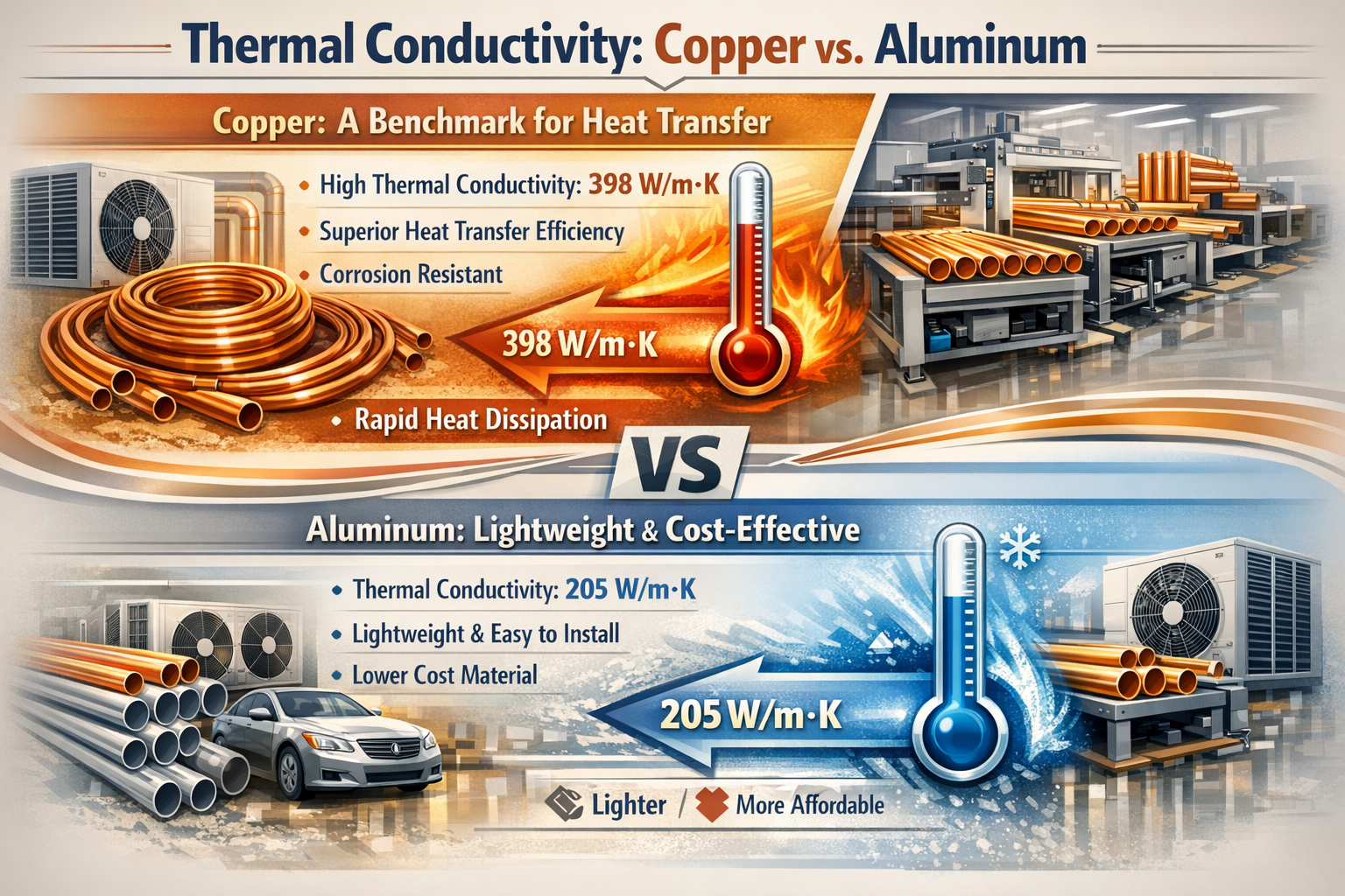 이 표는 두 제품 간의 뚜렷한 차이점을 강조합니다. 구리 그리고 알루미늄 튜브, 와 구리 우수한 제공 열전달 하지만 비용이 더 많이 들지만, 알루미늄 더 가볍고 비용 효율적 그러나 성능과 내구성 면에서 절충점이 있습니다.