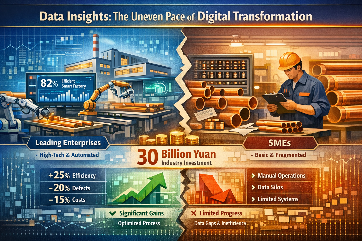 "ERP 시스템과 생산 모니터링 플랫폼에 800만 위안 이상을 지출했지만 결국 종이 기반 원장만 온라인으로 옮겼습니다. 생산 효율성은 크게 향상되지 않았고 직원의 업무량도 늘어났습니다." 왕씨는 중견기업의 사장이다. 구리관 허난성의 한 회사는 디지털 혁신에서 업계가 직면한 공통 딜레마를 표현했습니다. "Made in China 2025" 이니셔티브와 Industry 4.0 물결에 힘입어 구리 튜브 산업은 선두 기업부터 중소기업에 이르기까지 다양한 기업이 지능형 장비와 디지털 시스템에 막대한 투자를 하면서 디지털 변혁 노력이 급증했습니다. 그러나 현실은 대부분의 기업이 '과다 투자, 적은 수익'의 악순환에 갇혀 있고 디지털화가 피상적으로 남아 있다는 것입니다. 소수의 회사만이 디지털화를 활용하여 생산, 공급망, 고객 서비스의 전체 체인을 연결하여 비용 절감과 효율성 향상을 달성함으로써 심층적인 권한 부여를 달성했습니다. '디지털화를 위한 디지털화'라는 형식주의가 있고, 다른 한편으로는 '디지털화를 통한 가치창출 촉진'이라는 효과적인 변혁이 있다. 동관 산업의 디지털 전환에 왜 이러한 양극화가 존재하는가? 그 이면에는 인지적 편향, 기술 적응, 인재 지원 및 전략적 계획의 복잡한 상호 작용이 있으며, 이는 업계의 고품질 발전을 위한 핵심 원동력이기도 합니다.