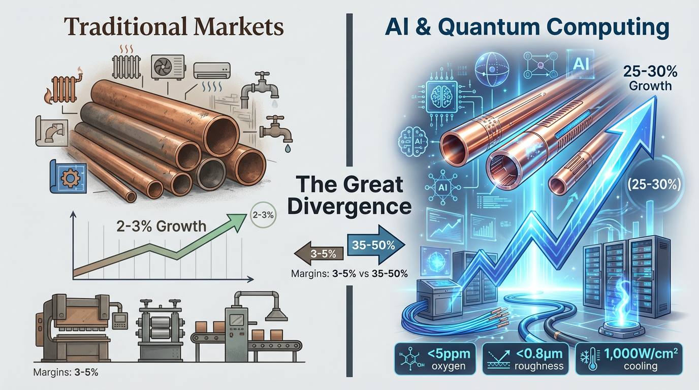 글로벌 구리관 산업은 전례 없는 분열을 경험하고 있습니다. 동안 전통적인 건축 그리고 HVAC 애플리케이션 매년 2~3%씩 성장하며 수요는 정밀 튜브 반도체 제조 분야에서는 AI 인프라, 양자컴퓨팅 등이 매년 25~30%씩 급증하고 있다. 이러한 차이로 인해 2단계 시장이 형성됩니다. 대량 생산업체는 3~5%의 마진으로 어려움을 겪고 있는 반면 전문 제조업체는 극단적인 사양을 충족하는 튜브의 경우 35~50%의 총 마진을 기록합니다.