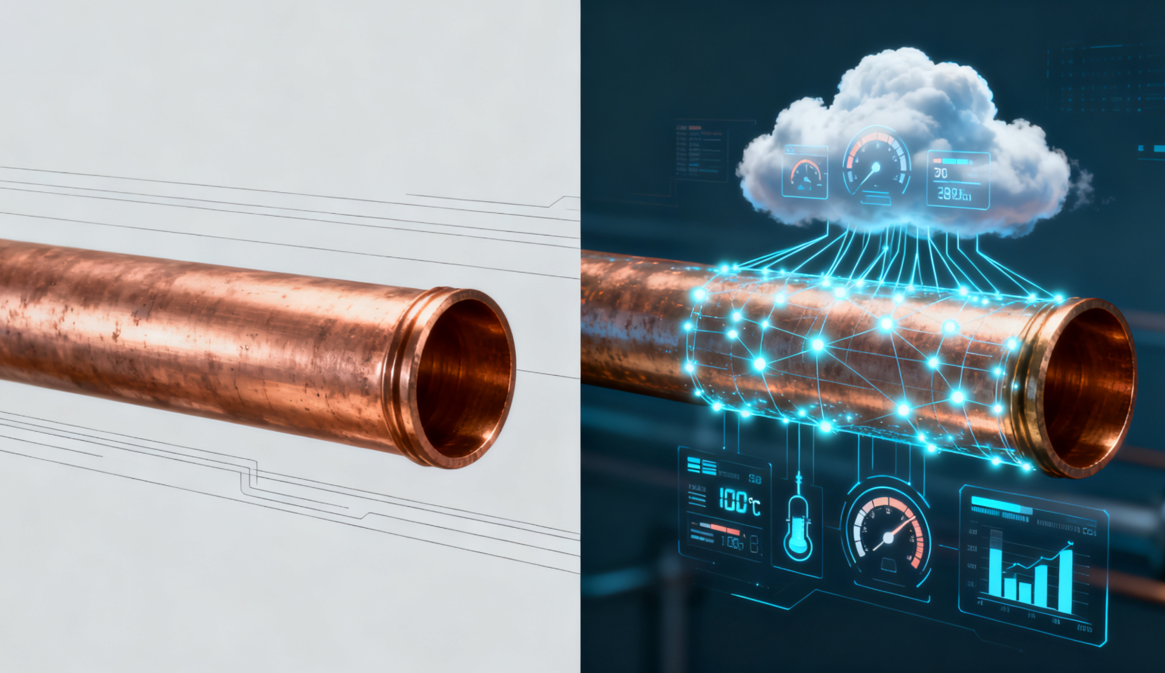 캡션: 정체성의 변형: 왼쪽의 조용한 파이프에서 오른쪽의 "말하는" 데이터 노드까지, 구리관의 가치는 디지털 기술에 의해 재정의되고 있습니다.