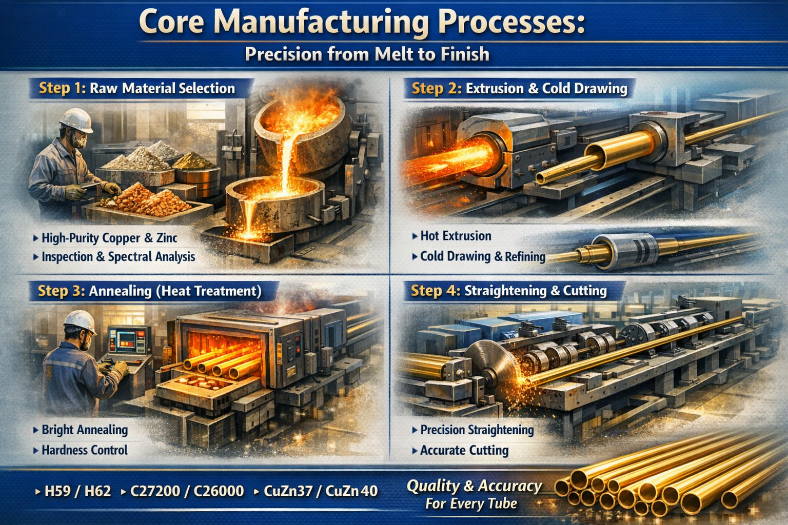 투명성은 B2B 파트너십에 대한 신뢰의 기초입니다. 전문적인 황동 튜브 공장은 단순히 튜브를 "만드는" 것이 아닙니다. 이는 제품의 모든 밀리미터가 국제 표준을 충족하도록 엄격하고 과학적으로 제어되는 순서를 따릅니다.